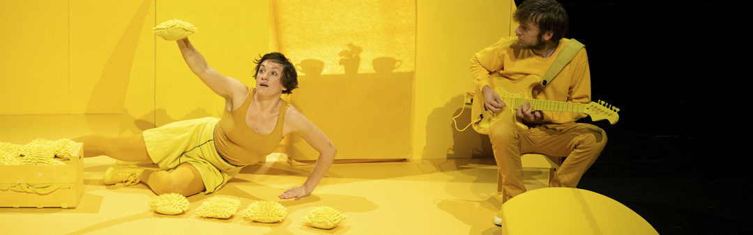 In Geel wordt het publiek meegenomen in een gele wereld waar alles, maar dan ook echt alles, geel is. Zelfs de bezoekers zitten op gele kussentjes. Geel is de kleur van de zon, van blijdschap. Met haar mimespel laat Anastasiia Liubchenko allerlei grappige gele bewoners tot leven komen. De originele livemuziek van Thijs Felperlaan en Yung-Tuan Ku verhoogt hierbij de magie.